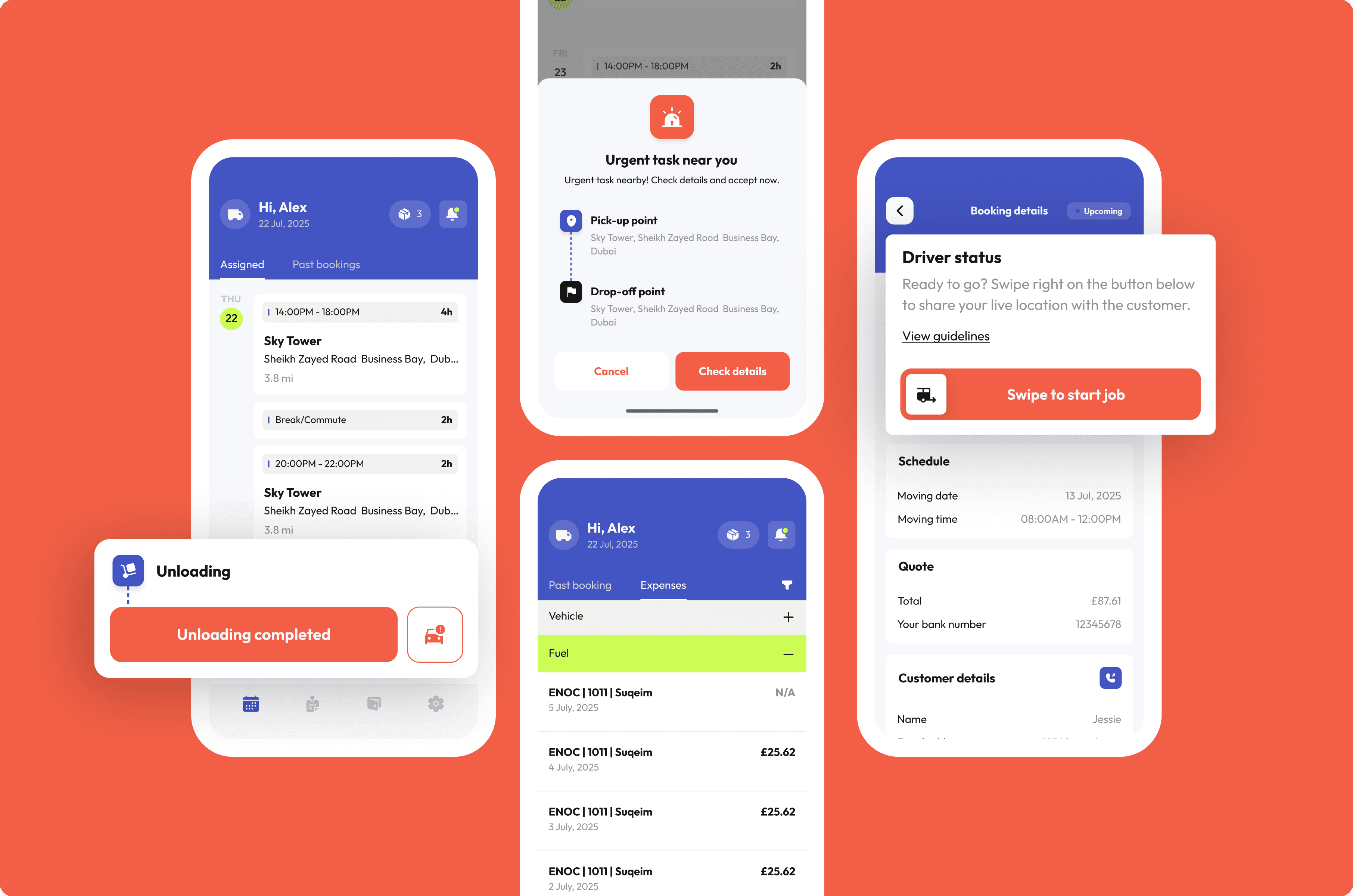 Moving towards the driver’s daily workflow, we focused on making job management simple and transparent. Drivers can track and manage their bookings through a clear dashboard showing routes, job status, and customer details at a glance. Every task includes a transparent quote, and if something changes mid-job, drivers can request a price adjustment directly in the app with notes or photos. To support their workday, we also added expense tracking for fuel, MOT, and insurance — helping drivers stay organised and in control without the hassle of paperwork.