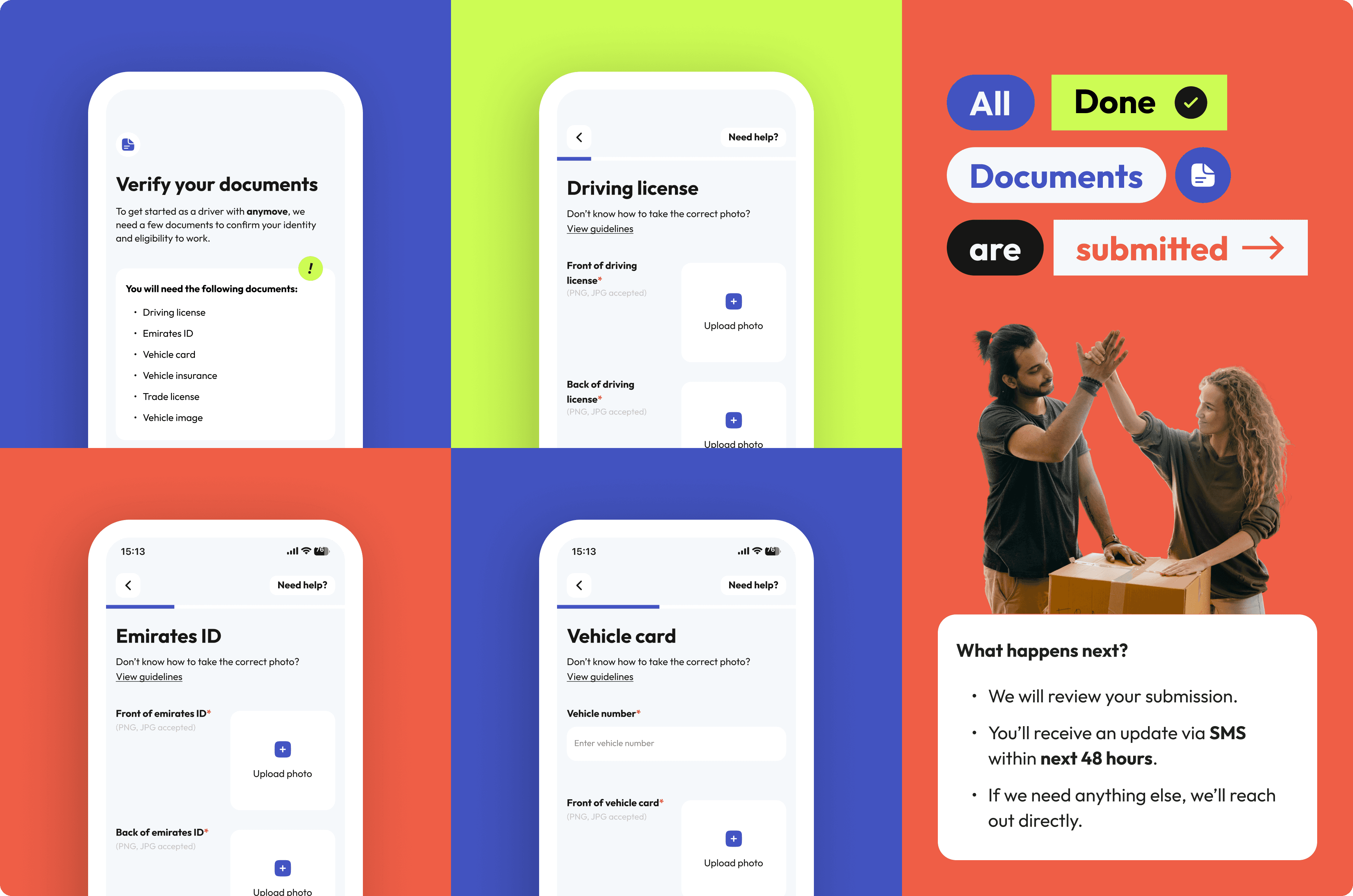 We started with the driver side, designing the verification process to be clear, visual, and language-friendly, especially for non-English-speaking drivers in Dubai. The flow relies on progress steps and instant feedback instead of long text, guiding drivers through ID and document uploads with ease.